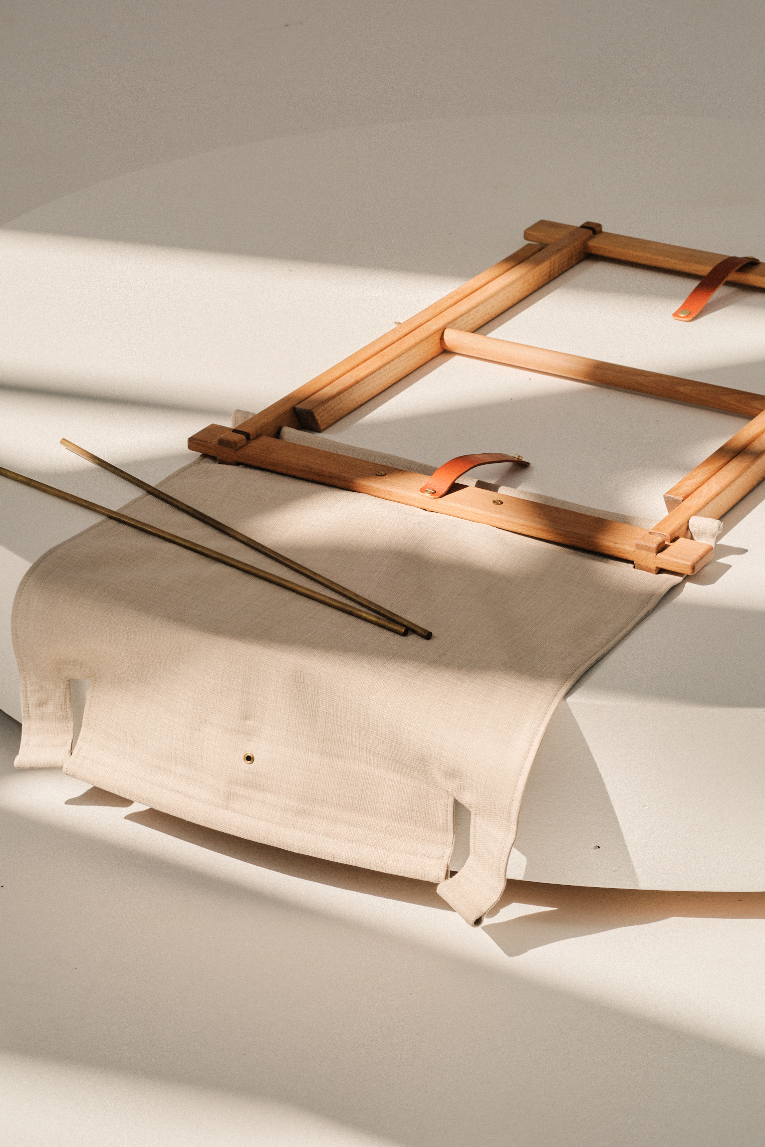 Muta es un mueble diseñado para el sector hotelero. Inspirado en el estilo de vida nómada, es de fácil transporte y cuenta con un sistema de plegado para su almacenaje. Además, las uniones por tornillería permiten la separación de las partes y hacen que sea un producto reparable y de fácil reciclaje. Muta nace de la reutilización de madera y tejido proveniente de mesas y cortinas del propio hotel, que han sido transformadas para dar lugar a esta nueva pieza. Dos barras de latón sujetan la tela sin necesidad de atornillar ni grapar. De esta forma, si la tela necesita ser limpiada o reemplazada, simplemente se debe desenfundar de las barras. Por último, las tiras de cuero sirven de asa para transportar la estructura y de cierre para su almacenaje.